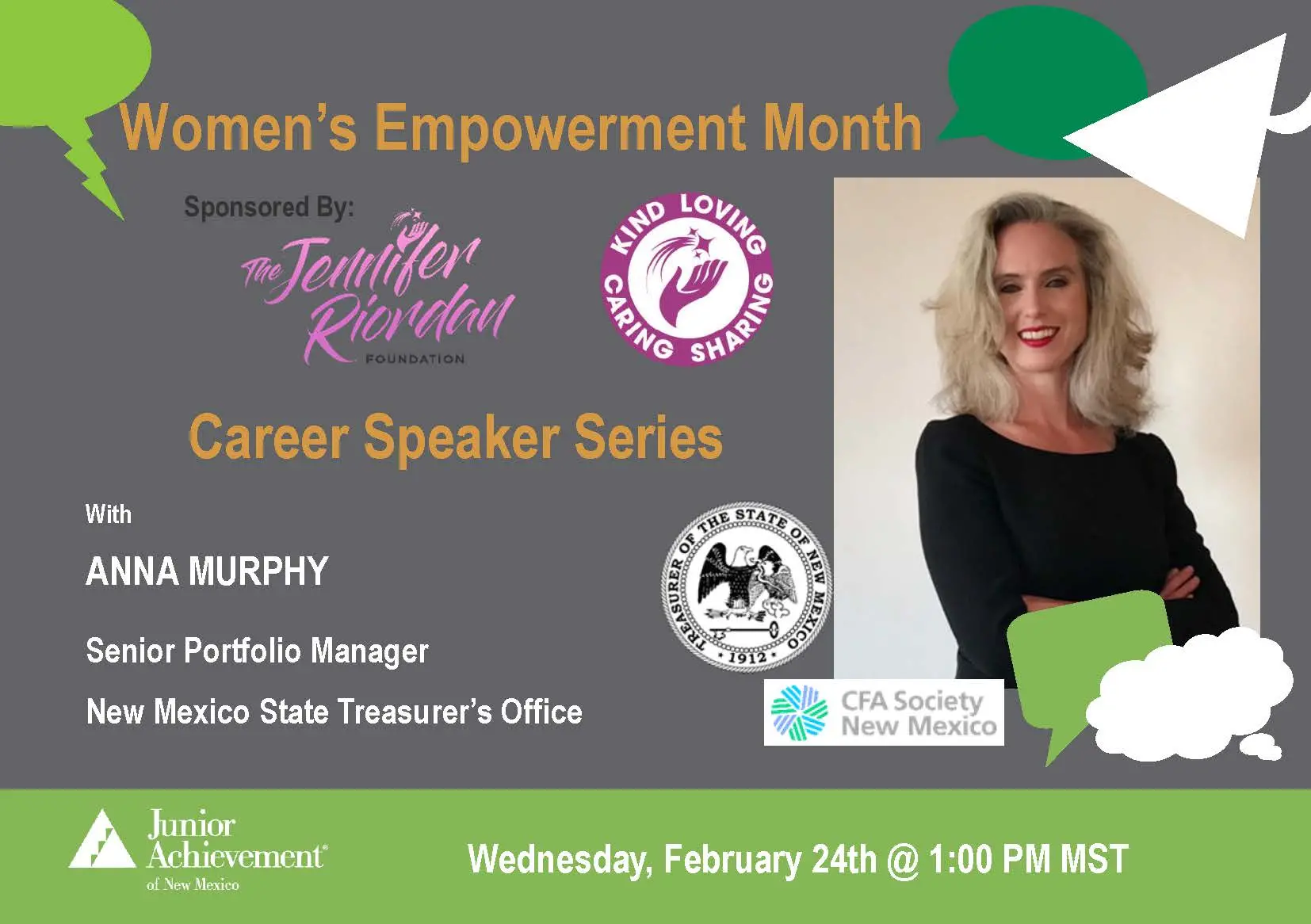Anna Murphy, Senior Portfolio Manager for NM State Treasurer's Office as well as a CFA Society Member, will be the last speaker of our February Women Empowerment Month Career Series, Sponsored by The Jennifer Riordan Foundation. Make sure to tune in to hear her career journey!