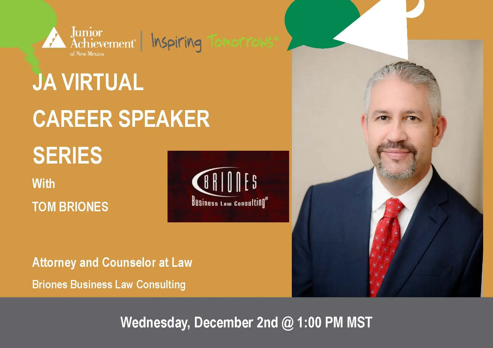 Welcome Tom Briones- Attorney & Counselor at Law at Briones Business Law Consulting. Mr. Briones moved to Albuquerque in 1997 and founded his current firm, Briones Business Law Consulting, P.C., in July of 2011. He aims to help small and medium sized corporations have access to quality legal protections and representation. Mr. Briones specializes in general business matters, corporate matters, contract review, contract creation, transactions, collections, business litigation, compliance issues, employee matters, workers compensation, intellectual property, and liquor licensing.